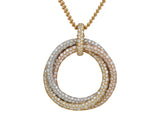 The pendant is designed as three interlocking eighteen karat yellow, rose or white gold rings, set with (349) round brilliant-cut diamond pavé. The pendant suspends from a two-row beaded yellow gold chain. The pendant measures 32.00 x 26.00 mm. The chain measures 16.00 inches. It is marked with the serial number, maker and hallmarks. It is accompanied by its original box and certificate of authenticity dated 2024. The retail price is $24,900.