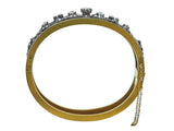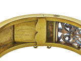 The wide eighteen karat yellow gold bangle is set to the front with a silver-topped floral design, enhanced by (7) old mine cut and (99) rose cut diamonds. The approximate total diamond weight is 2.70 carats, including a principal stone of approximately 0.50 carat. The bangle is fitted with a single hinge closure, and safety chain. The interior circumference is 6.75 inches and it measures 17.30 mm in width.