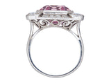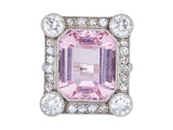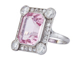 Designed as an emerald-cut Morganite, measuring 13.20 x 11.00 x 7.00 mm and weighing approximately 7.15 carats, framed by (24) round brilliant cut diamonds in platinum. The ring is a size 4.25. The piece is unmarked.