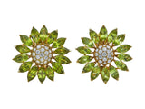 Each designed as an eighteen karat yellow gold flower head, set with (28) marquise-cut peridot petals and centered by (38) round brilliant-cut diamond pavé. The backs are fitted with posts for pierced ears and omega clips. The earrings measure 27.00 mm in diameter. They are stamped with the maker's mark, assay and Italian registration marks. The earrings are accompanied by their original box.
