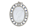 The reverse carved crystal intaglio features a discus thrower, set in a delicately millegrained platinum pendant. The pendant features (143) rose cut diamonds, weighing approximately 0.55 carat total weight, and (12) circular cut sapphires. The pendant measures 2.0 inches in length and 1 3/8 inches in width.