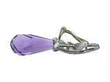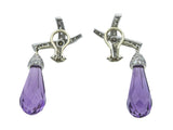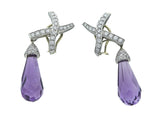 Each with an iconic diamond set "X" top suspending a detachable diamond and faceted amethyst drop. Set with (96) round brilliant cut diamonds weighing approximately 2.78 carats in platinum. They are 2 inches long with the drops and 7/8 inch long without they weigh 18.31 grams. The earrings are fitted with omega backs for pierced or non-pierced ears. They are stamped by the maker, with date, and control marks.