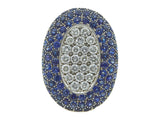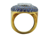 The substantial eighteen karat yellow gold form is set to the front with (22) round brilliant cut diamond and (64) circular cut sapphire pavé. The total approximate diamond weight is 1.80 carats and the total approximate sapphire weight is 5.60 carats. The ring is marked for its assay.