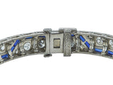 A line of (48) old European cut diamonds, weighing approximately 3.25 carats, box set in platinum and trimmed in (48) calibré cut synthetic sapphires. The length is 7.00 inches and the width is 6.30 mm. The bracelet is unmarked.