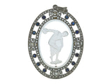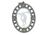 The reverse carved crystal intaglio features a discus thrower, set in a delicately millegrained platinum pendant. The pendant features (143) rose cut diamonds, weighing approximately 0.55 carat total weight, and (12) circular cut sapphires. The pendant measures 2.0 inches in length and 1 3/8 inches in width.