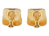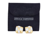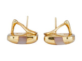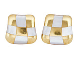Each designed as a polished eighteen karat yellow gold clip with checkerboard mother-of-pearl inlay. The earrings are fitted with posts and omega backs for pierced ears. They measure 3/4 inch in length. The earrings are marked by the maker and for its assay.