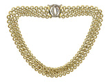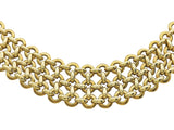 Designed as a series of three polished interconnecting rows of circular and bar-shaped links centering a clasp designed as two intertwined letter C's. Set with (32) round brilliant cut diamonds weighing approximately .50 carat total. The necklace measures 14 inches long and 3/4 inch in width. The necklace is marked by the maker, numbered, and for its assay. It is accompanied by its original pouch.