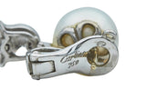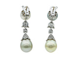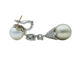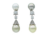 Each designed with a white and grey south sea pearl above a row of two round brilliant cut diamonds suspending south sea pearl drops with pave diamond caps, mounted in eighteen karat white gold. Set with (94) round brilliant cut diamonds, weighing approximately 3.00 carats. They are fitted with posts and omega backs for pierced ears. The earrings are 1 7/8 inch in length and weigh 19.86 grams. The earrings are marked by the maker, with their serial number, assay and hallmarks.