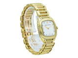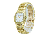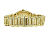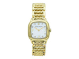 The watch designed in polished 18K yellow gold with a cable link bracelet. Featuring a diamond set mother of pearl dial. It's interior circumference is approximately 6 1/4 inches; it weighs 102 grams. It is marked by maker and for assay.