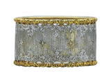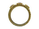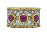 Designed as a wide engraved eighteen karat white gold band, with ornate yellow gold edges, centered by (3) circular cut rubies, weighing approximately 0.66 carat total, and further enhanced by (24) round brilliant cut diamonds, weighing 0.24 carat total. It is a size 6 and measures 11.50 mm in width. The ring is signed by the maker and marked for assay.