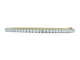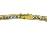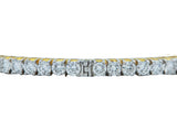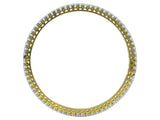 Designed as an eighteen karat yellow and white gold hinged bangle bracelet. Prong set with with (69) round brilliant cut diamonds, weighing approximately 6.90 carats. The width is 3.50 mm and its inner circumference is 7 inches; it weighs 20.2 grams.