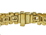 The bracelet is designed in polished eighteen karat yellow as a line of basket weave links. It is 7 1/8 inches long and 3/8 inch wide; it weighs 49.1 grams. It is stamped by the maker, with year, and for assay.