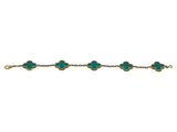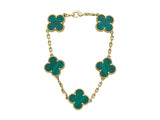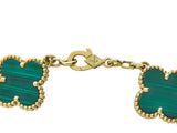 Designed as five iconic motifs composed of malachite framed in perlée mounted in eighteen karat yellow gold, on a geometric chain. The length is 6 7/8 inches; it weighs 12.4 grams. It is marked for the maker, with its serial number, assay and hallmarks. The bracelet is accompanied by its box, care booklet, certificate and service paperwork dated 2022. The current retail is $6,000